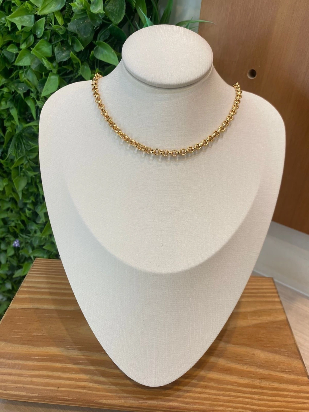 Colar de correntaria dourada com 45 cm de comprimento e extensor para regulagem de tamanho.